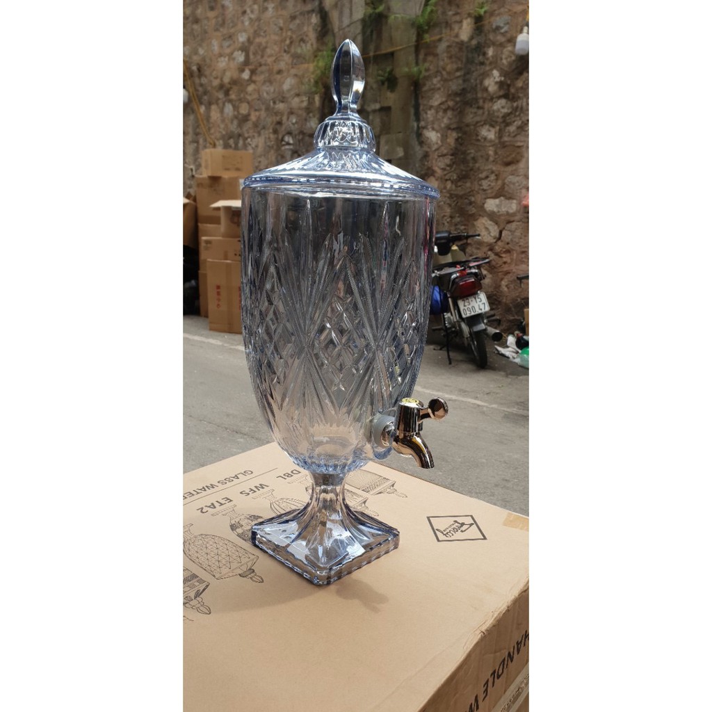 Bình thủy tinh cao cấp với hoa văn thiết kế sang trọng nhìn rất giống một chiếc cúp, bình có nắp đậy đẹp và hợp vệ sinh, vòi vặn tiện lợi. Bạn có thể sử dụng nó để đựng nước hoa quả, ngâm rượu. Những vị khách tới nhà sẽ phải trầm trồ khen ngợi trước những bình đựng rượu tuyệt hảo có một không hai như thế này.