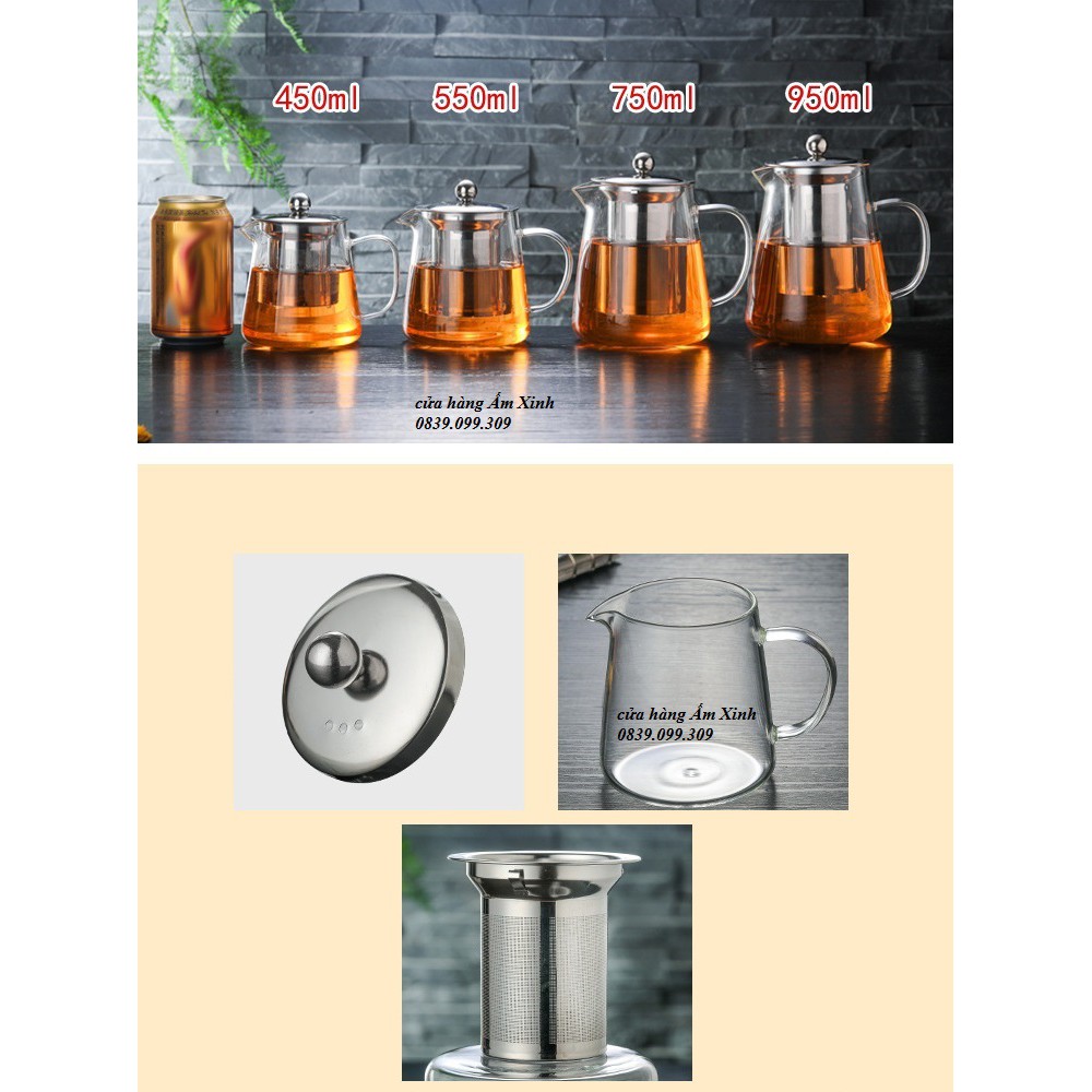 + Bình pha trà thủy tinh có lõi lọc inox 304 có 04 dung tích khách nhau: 450 ml, 550 ml, 750 ml, 950 ml.