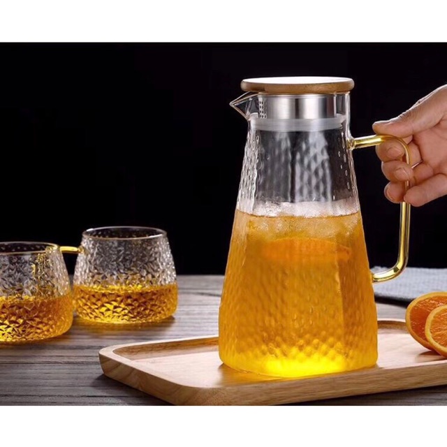 Bình thuỷ tinh sần nắp gỗ, quai màu vàng hiện đại, đẹp mắt. Thuỷ tinh chịu nhiệt tốt đến 130•c. Bình dùng đựng nước lọc, nước hoa quả hay pha trà đều phù hợp.Dung tích: 1500ml và 1700ml