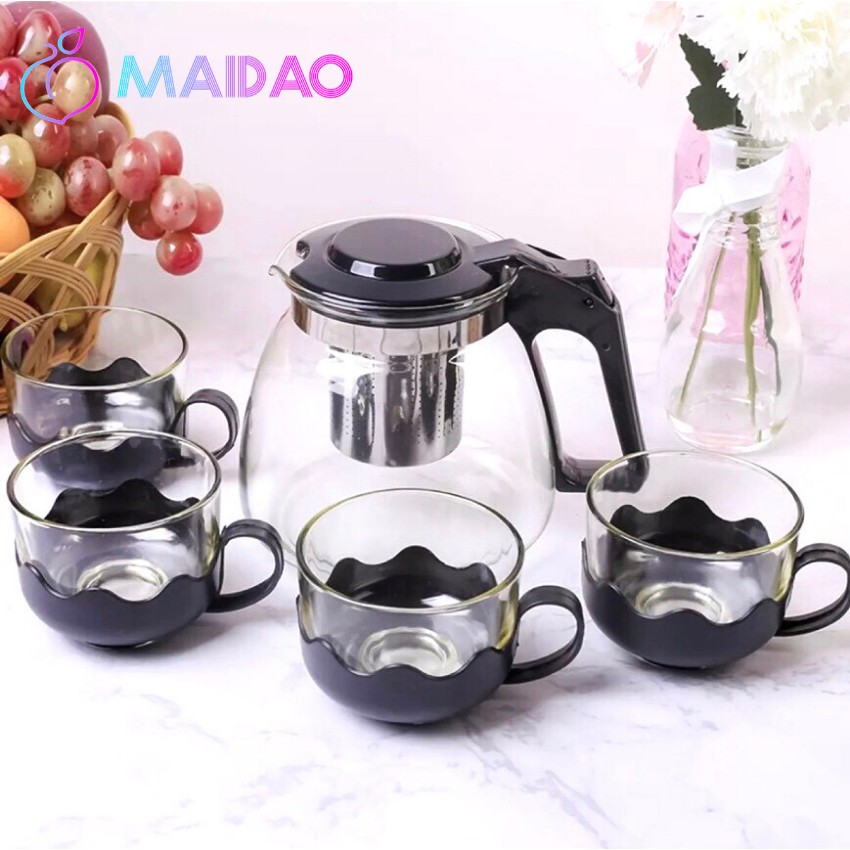 Bình trà thuỷ tinh có túi lọc inox dung tích 1000ml thiết kế độc đáo + Tặng kèm 4 ly thuỷ tinh BT-T002