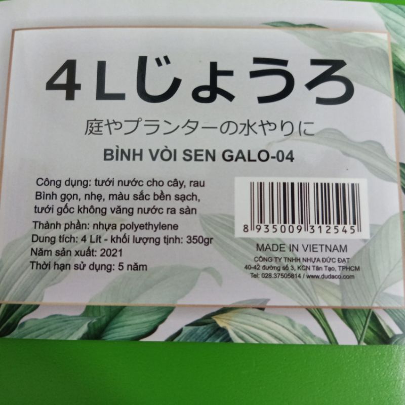 Bình tưới cây vòi sen Dudaco galo-04 được sản xuất bằng nhựa HDPE chính phẩm bền, có thể để ngoài trời lâu ngày không bị nứt vỡ. Bình tưới vòi sen Galo-04 được thiết kế thông minh với các phần: thân bình, vòi tưới, vòi sen (ô doa), được tháo lắp dễ dàng và sử dụng rất tiện lợi.
