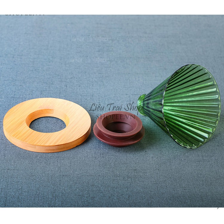 Bộ bình và phễu v60 pha cà phê giấy lọc Pour over drip brew giá gỗ tròn nhiều màu gioăng siliconeBộ sản phẩm gồm bình 500ml và nắp bình, phễu pha cà phê thuỷ tinh có nhiều màu sắc, giá gỗ tre có silicone giữ cố định phễu. Bình phù hợp pha cho 1-3 người.