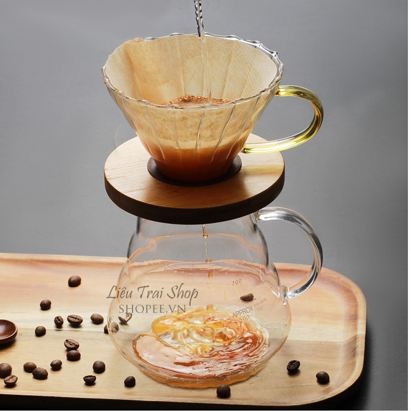 Bộ bình và phễu v60 pha cà phê giấy lọc Pour over drip brew giá gỗ tròn gioăng silicone có quai