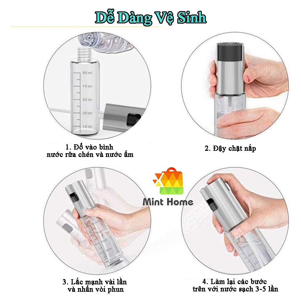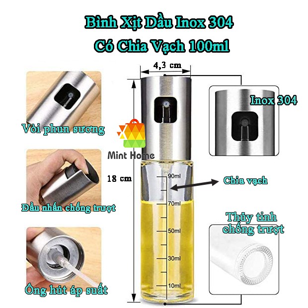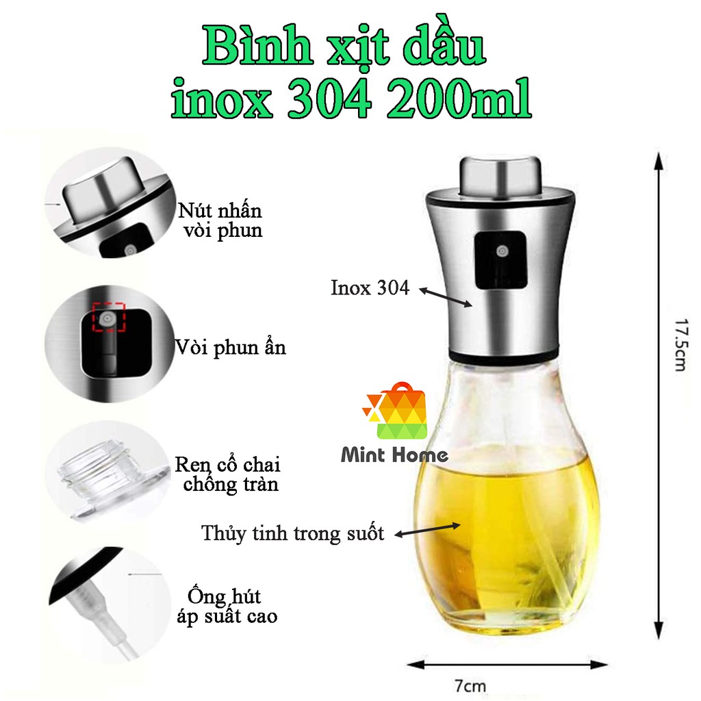 Bình xịt dầu ăn kiêng, olive, nước, đựng dấm táo, gia vị phun sương chai thủy tinh nắp inox phụ kiện nồi chiên không dầu 100ml 200ml (quà tặng: phễu + chổi)Sản phẩm khôg thể thiếu cho căn bếp và NCKD