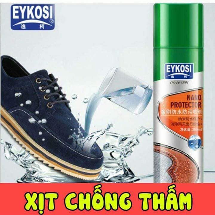 Tác dụng của Bình xịt chống nước Eykosi:- Chống thấm hoàn hảo. Đi xe máy trời mưa, bạn sẽ bớt dc nỗi lo phải co chân lên khi có xe chạy vắt nước lên, hoặc bùn đất bắn lên giày của bạn.