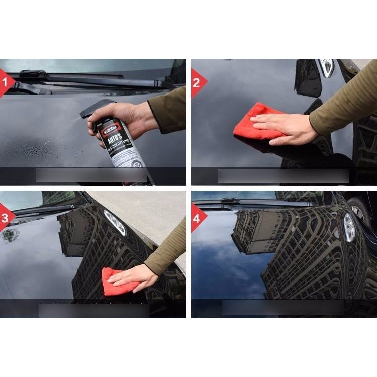 Bước 2: Lắp vòi xịt vào chai lớn chứa dung dịch nano, để cách bề mặt xe khoảng 10-20cm và xịt kín bề mặt cần phủ bóng. Dùng khăn bông mềm (loại khăn không bị xù lông) lau nhẹ nhàng để làm ướt đều dung dịch lên toàn bộ bề mặt xe sau đó để khoảng 2 phút.