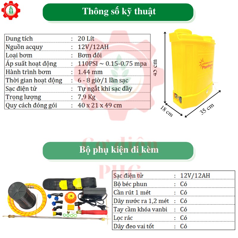 Bình xịt thuốc, bình phun khử khẩn Panthera 20L 12V 8AH | 1 bơm | Công nghệ Thái Lan | Bảo hành 06 tháng❗❗❗Hãy làm phong phú thêm danh mục các dụng cụ thiết bị làm vườn của bạn!