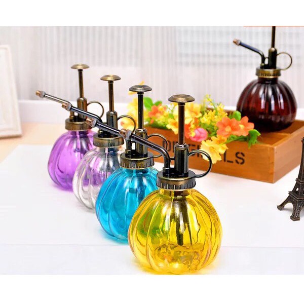 Bình nước tưới cây bằng thủy tinh và vòi xịt nhựa mạ màu đồng kiểu vintage.Cách sử dụng: tháo phần vòi kim loại, cho nước vào, đóng lại. Nhấn nút để xịt. Phù hợp để tưới những cây nhỏ như xương rồng, sen đá...