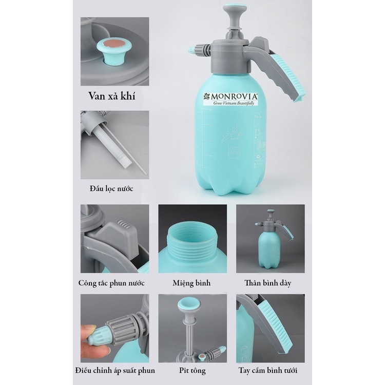 Giới thiệu Bình xịt tưới cây MONROVIA 2 lít, phun sương tưới cây cảnh, vòi dài, tặng vòi ngắn, cần bán tự động, tiêu chuẩn Châu Âu