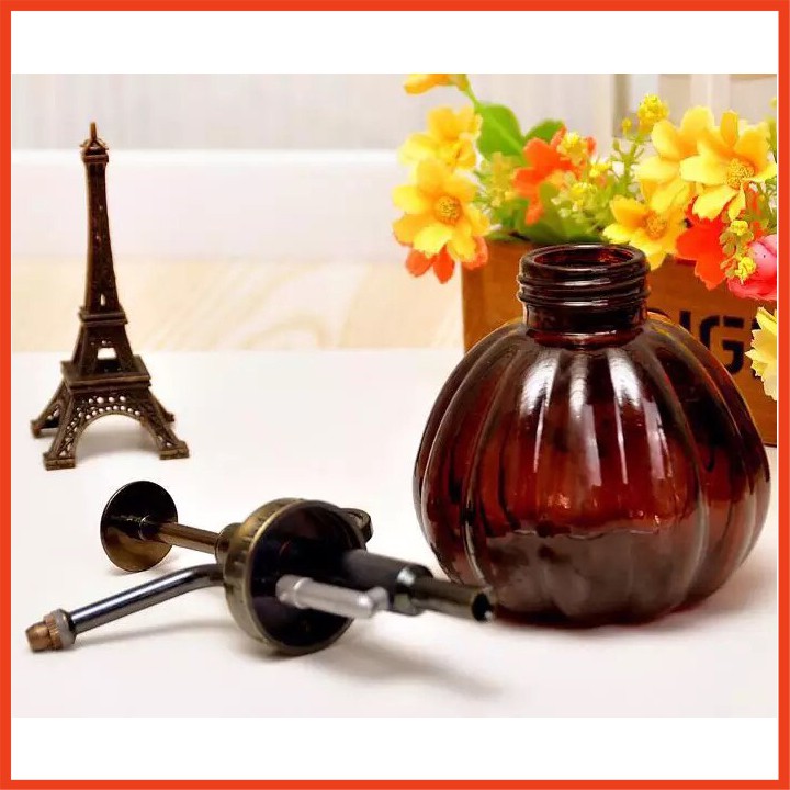 Bình nước tưới cây bằng thủy tinh và vòi xịt nhựa mạ màu đồng kiểu vintage.