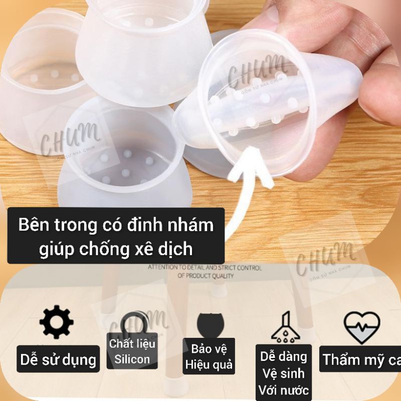 Chất liệu Silicon Chống xước cho sàn nhà và giảm tiếng ồn, tăng ma sát Chịu mài mòn tốt hơn so với nhựa PVC; Độ mút của cao su đối với chân bàn ghế sẽ chặt hơn, nút bịt cao su sẽ không dễ bị rơi ra ngoài, có khả năng chịu dầu và chịu hóa chất trong trường hợp cần làm sản phẩm đặc biệt.