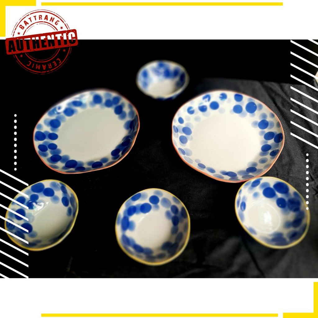 Bộ đĩa méo xuất âu sản phẩm vẽ tay độc đáo, sản xuất tại xưởng gốm sứ authentic bat trangĐĩa méo vẽ tay thủ công rất kỹ, với màu xanh cô ban chấm bi, đường bo viền màu vàng làm cho sản phẩm càng trở nên độc đáo hơn