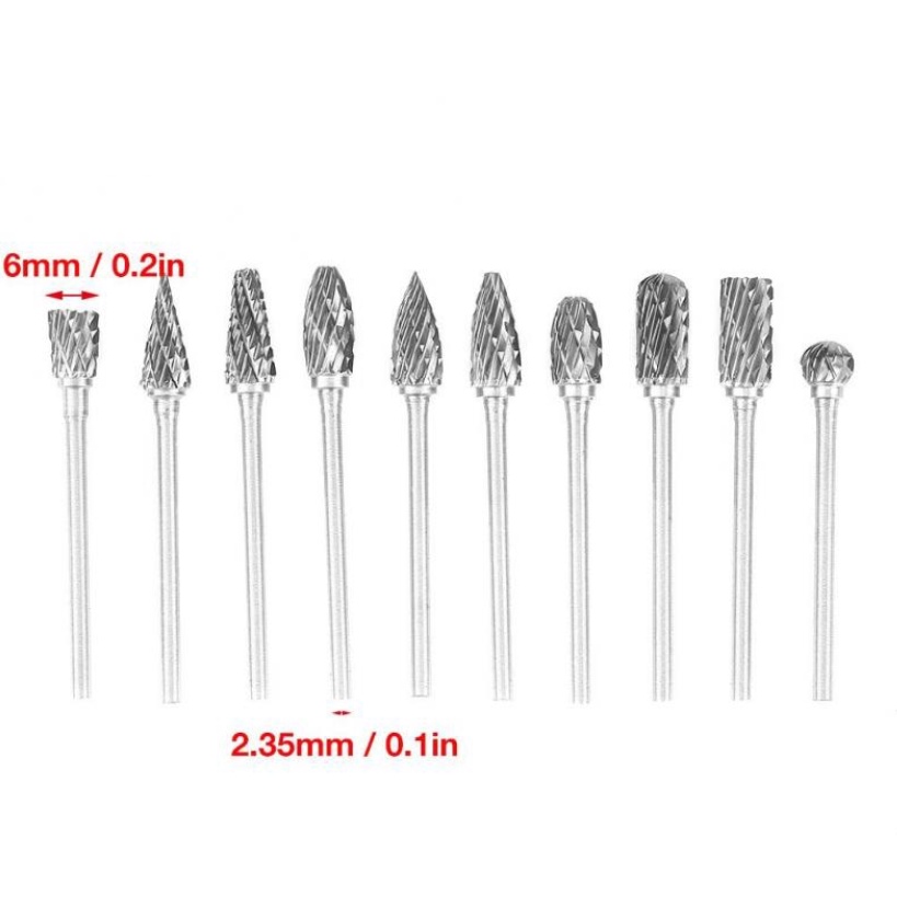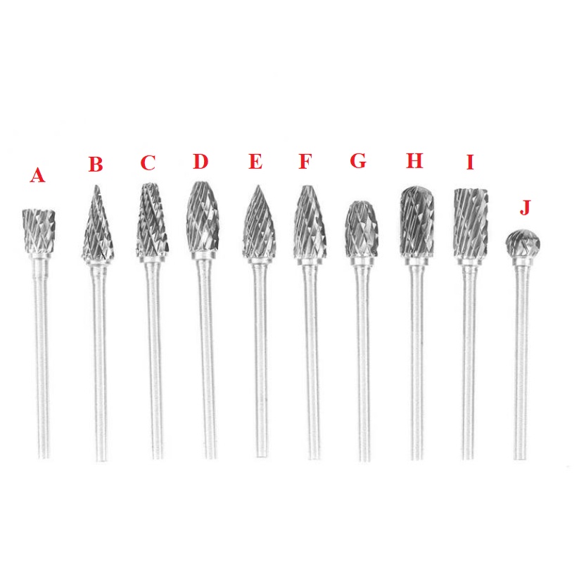 Các đầu được chế tạo từ Tungsten, cứng và rất sắc. kích thước trục 3 mm, thích hợp dùng cho các loại máy khoan cầm tay mini, dremel và các loại máy khác có tốc độ vòng quay từ 6.000 - 50.000 vòng.