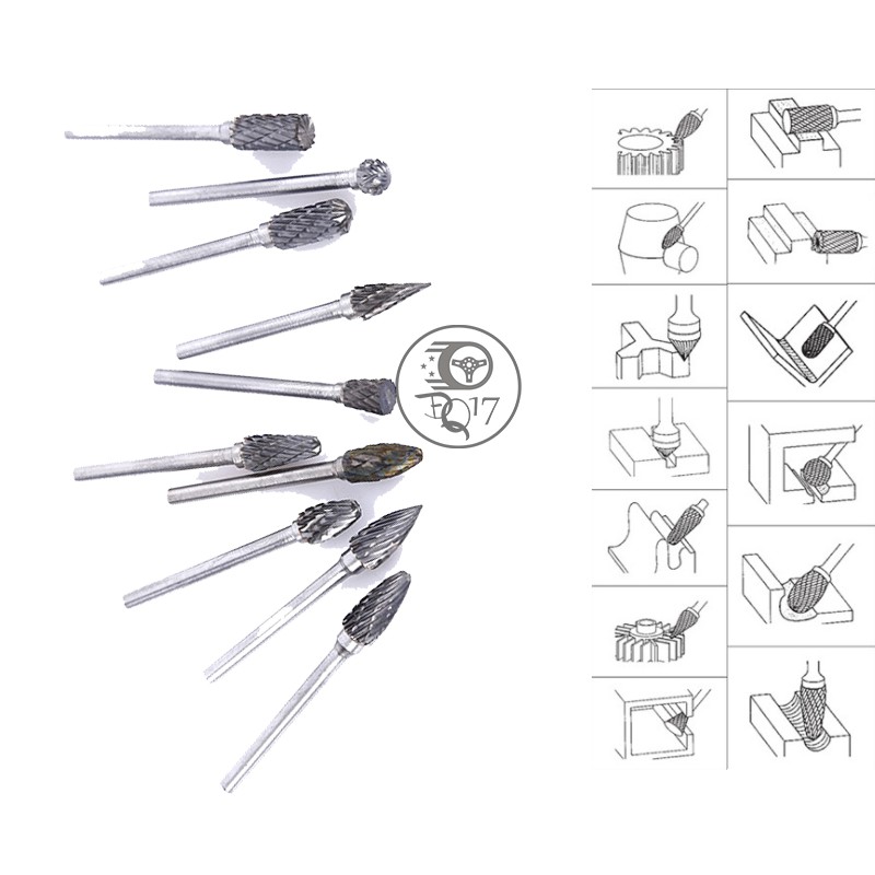 - Bộ 10 Mũi mài cán 3 ly với nhiều hình dáng khác nhau.