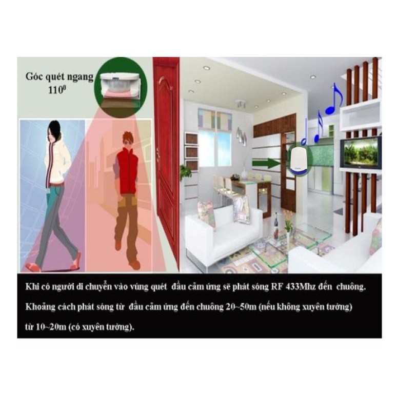 Khi có người di chuyển vào vùng quét đầu cảm ứng sẽ phát sóng RF 433MHz đến chuông