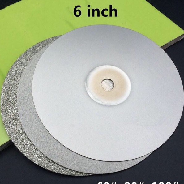 Đĩa mài kim cương 6 inchĐĩa mài kim cương 150mm(6 inch) có độ mịn hạt #60, #80 , #100, thích hợp cho việc mài thô/mịn ngọc, đá, dao khắc và các mục đích phù hợp khác. Có thể sử dụng khô hoặc kết hợp với nước. Sau khi sử dụng với nước cần rửa sạch bụi bám trên bề mặt, lau khô để đảm bảo tuổi thọ lâu dài.