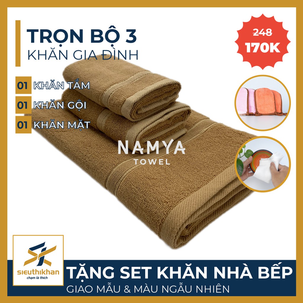 BỘ 3 KHĂN CHO GIA ĐÌNH: 1 KHĂN TẮM, 1 KHĂN GỘI, 1 KHĂN MẶT + SET KHĂN BẾP