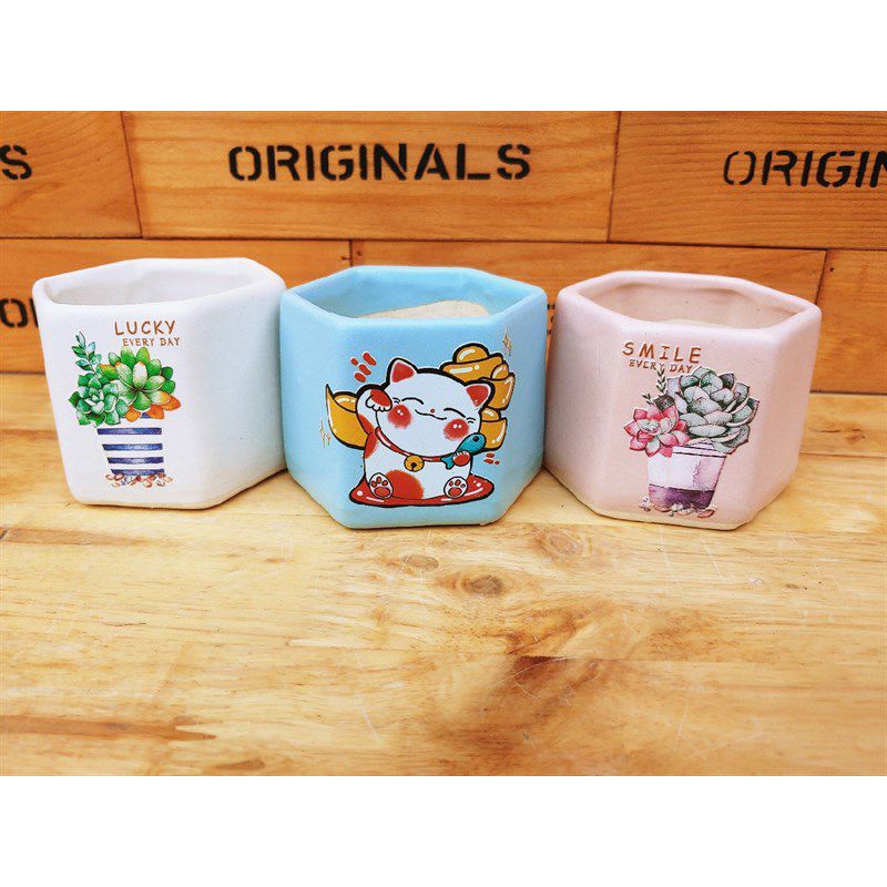 GIÁ BAO GỒM BỘ 3 CÁI CHẬU LỤC GIÁC DECAL BÁT TRÀNGKích thước:lớn 8cm x 12cm