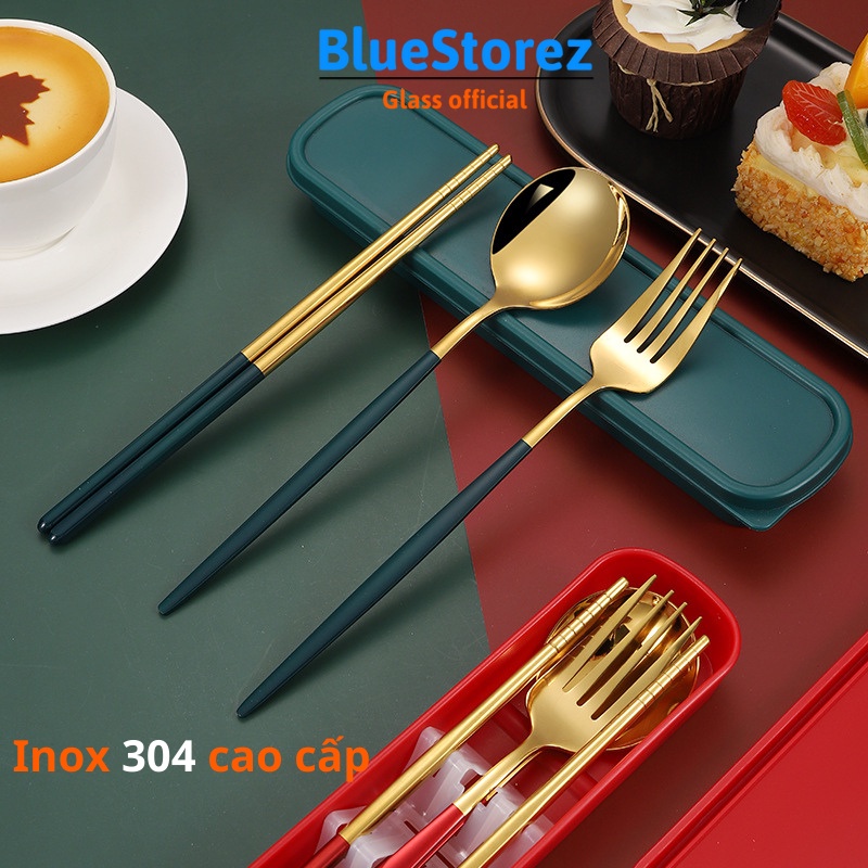 Bộ 3 món muỗng đũa thìa nĩa inox 304 cao cấp mạ vàng-dụng cụ ăn cơm văn phòng dã ngoại-BLUESTORE