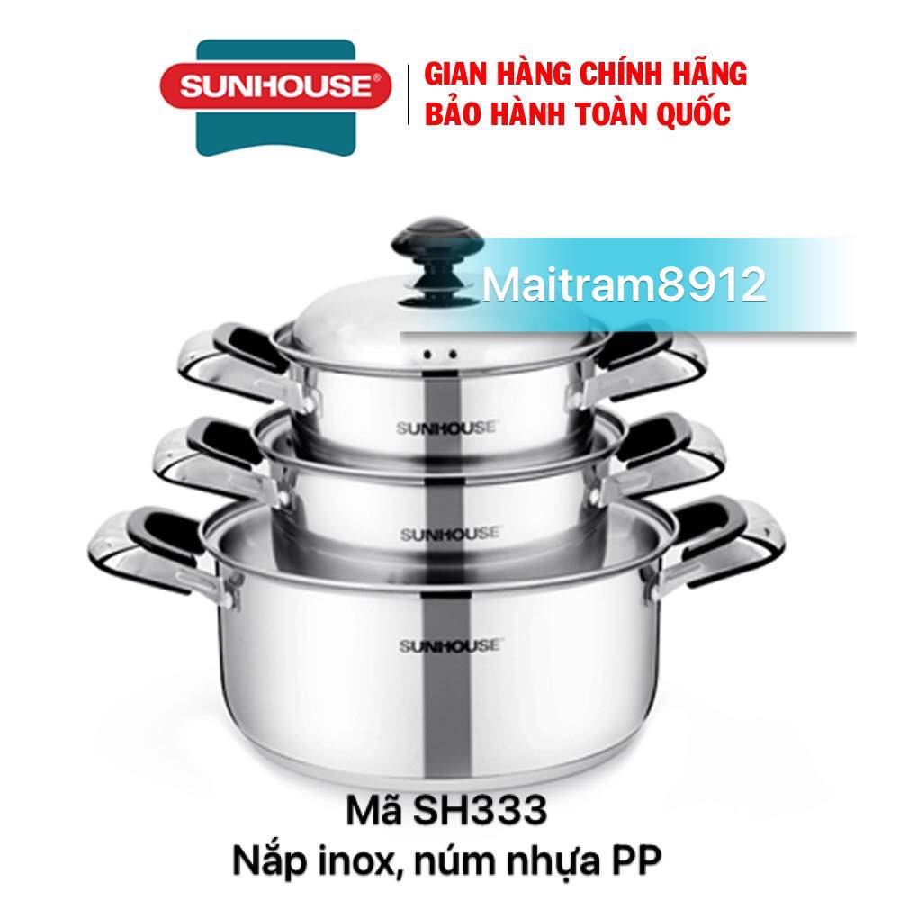 1/ Bộ nồi inox 3 đáy SUNHOUSE SH333 (nắp inox, núm nhựa PP, quai inox kết hợp nhựa PP)