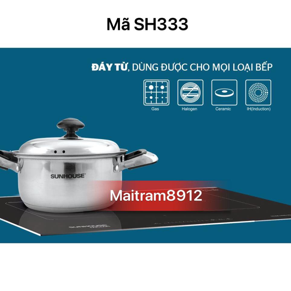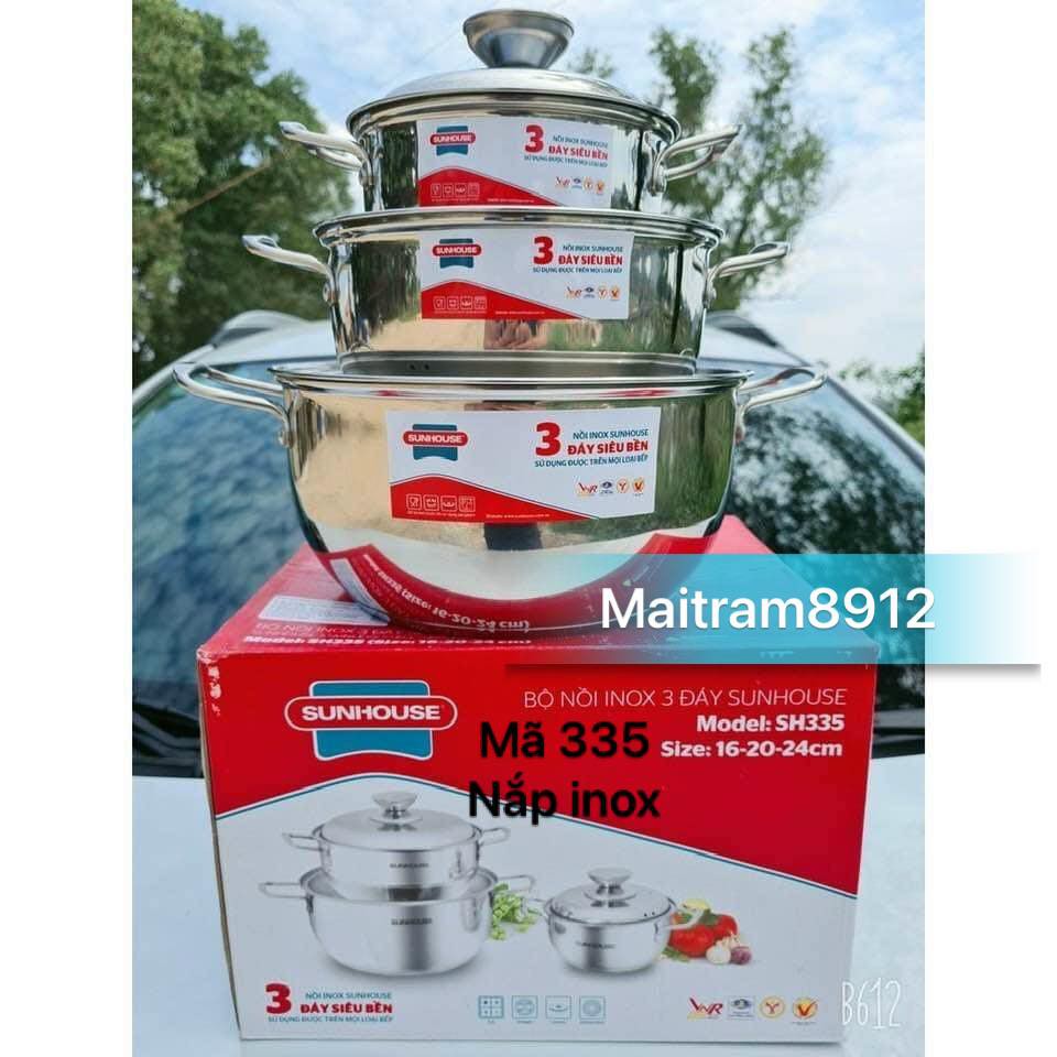 Giới thiệu BỘ 3 NỒI INOX 3 ĐÁY SUNHOUSE SH 333 - 334 - 335, ĐÁY TỪ (DÙNG ĐƯỢC BẾP ĐIỆN TỪ), GỒM NỒI 16 CM, 20 CM, 24 CM