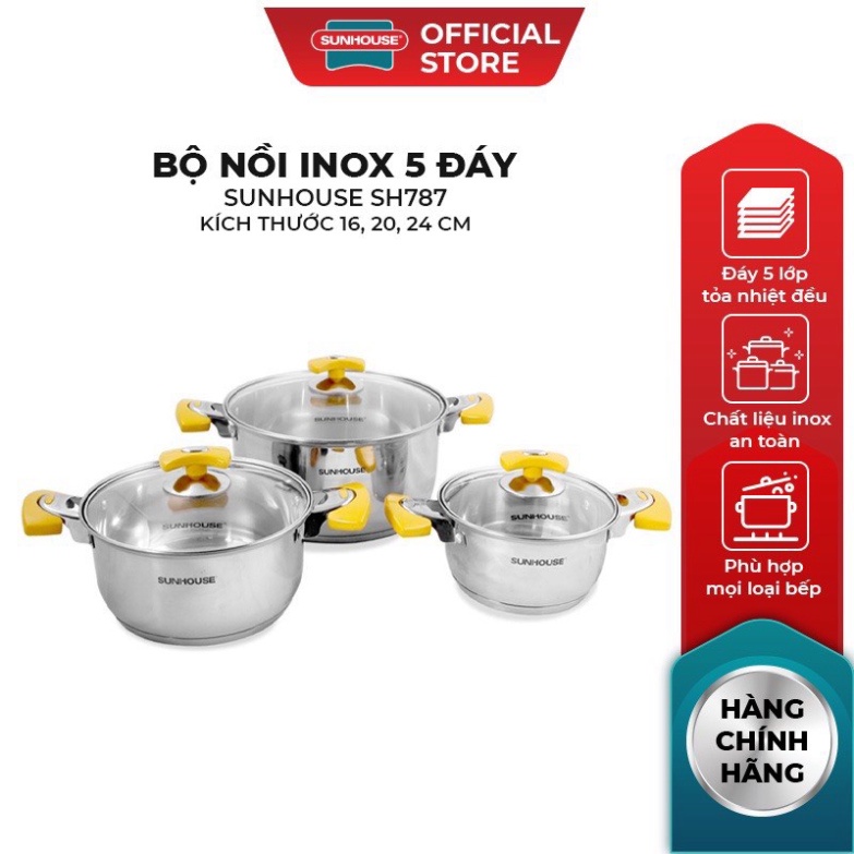 BỘ 3 NỒI INOX 5 ĐÁY SUNHOUSE SH787( 5 đáy siêu bền) -Hộp xấu