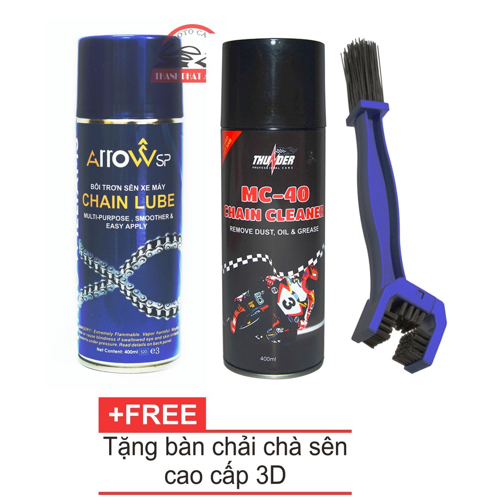 BỘ 3 SẢN PHẨM CHAI XỊT BÔI TRƠN SÊN XE MÁY ARROW CHAIN LUBE 400ML + XỊT SÊN MC-40 400ml TẶNG BÀN CHẢI CHUYÊN NGHIỆP 3D