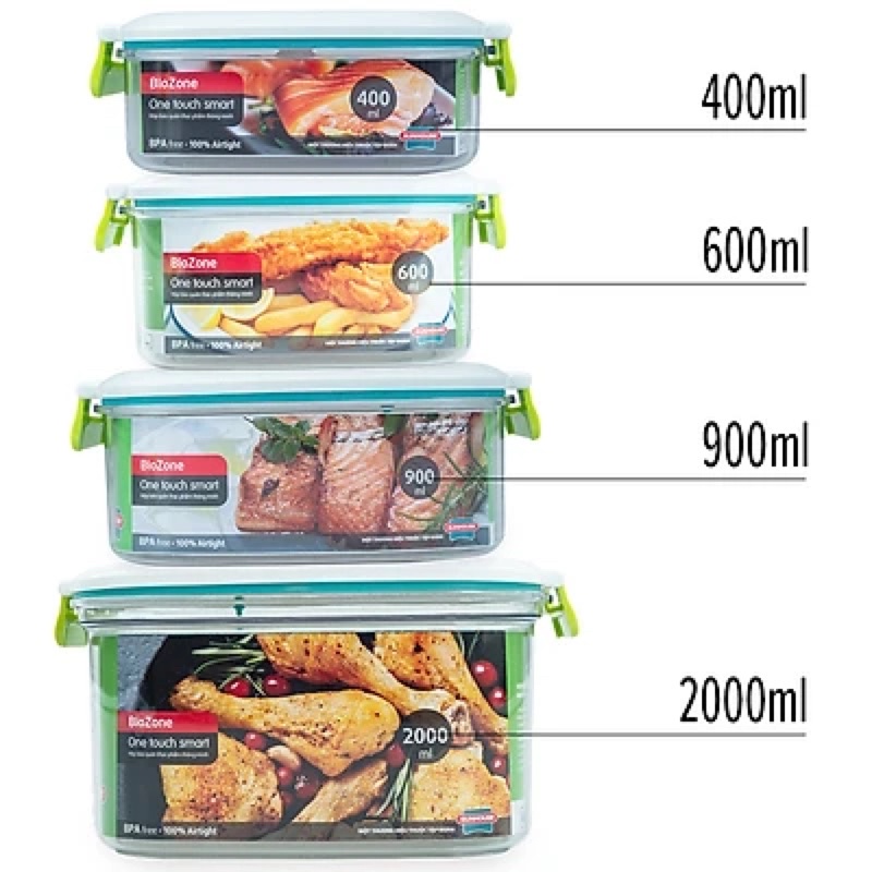 Bộ 4 hộp bảo quản thực phẩm thông minh Biozone được làm từ nhựa SAN nguyên sinh, đã thông qua kiểm định theo tiêu chuẩn về an toàn vệ sinh thực phẩm, không chứa BPA, không màu, không mùi, không tiết ra các chất có hại trong quá trình sử dụng, đảm bảo an toàn cho sức khỏe người dùng.Bộ sản phẩm với thiết kế thông minh, tiện dụng với nắp hộp làm bằng nhựa PC với 2 khóa bản lề chắc chắn và rất dễ thao tác đóng mở. Kiểu khóa này có độ bền cao, không lo bị gãy gập sau thời gian dài sử dụng. Van silicone trên nắp hộp có tác dụng xả bớt không khí trong hộp chỉ với một lần ấn nhẹ, giúp giảm độ ẩm và tốc độ oxi hóa, ngăn ngừa thất thoát vitamin, giữ nguyên độ tươi ngon của thực phẩm.