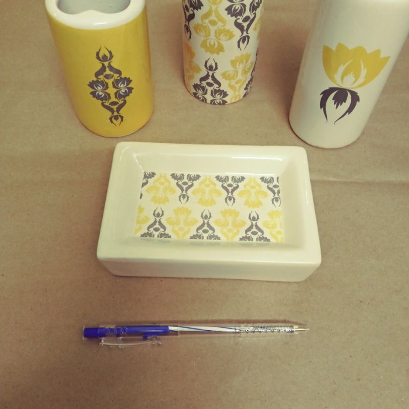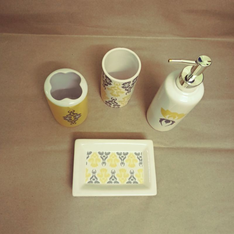 Bộ 4 món đồ dùng cho nhà tắm gồm 1 khay đựng xà bông, 1 cốc đựng bàn chải, 1 cốc nước, 1 lọ đựng nước rửa tay.Chất liệu: sứ.