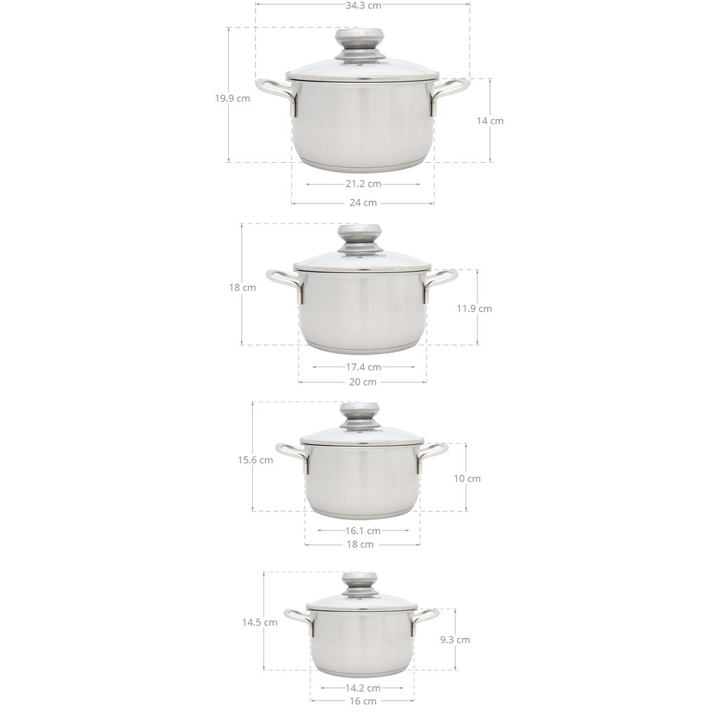 Bộ nồi gồm có 4 nồi: nồi nhỏ 16 cm kho, om, 2 nồi trung 18 cm và 20 cm nấu canh, nồi lớn 24 cm luộc gà nguyên con khoảng 1.5 kg.