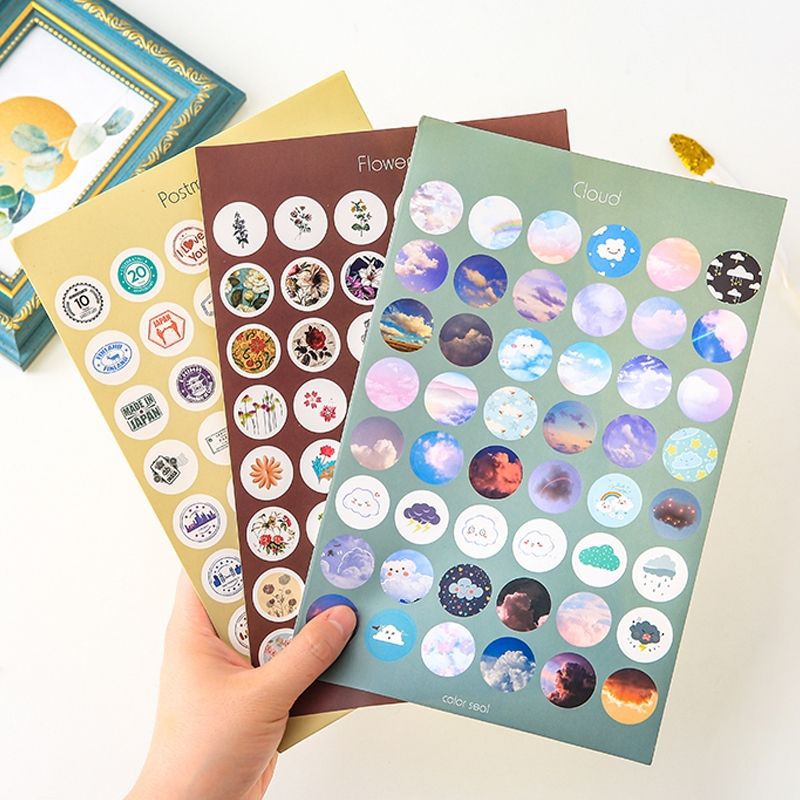 Sản phẩm: Bộ 48 miếng dán niêm phong bao bì, dán trang trí hình tròn nhiều họa tiếtChất liệu: Giấy