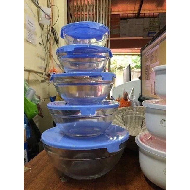 Bộ 5 bát thuỷ tinh kèm nắp siêu đẹpSẵn hàng mau ngẫu nhiên- e sẵn nắp xanh dương
