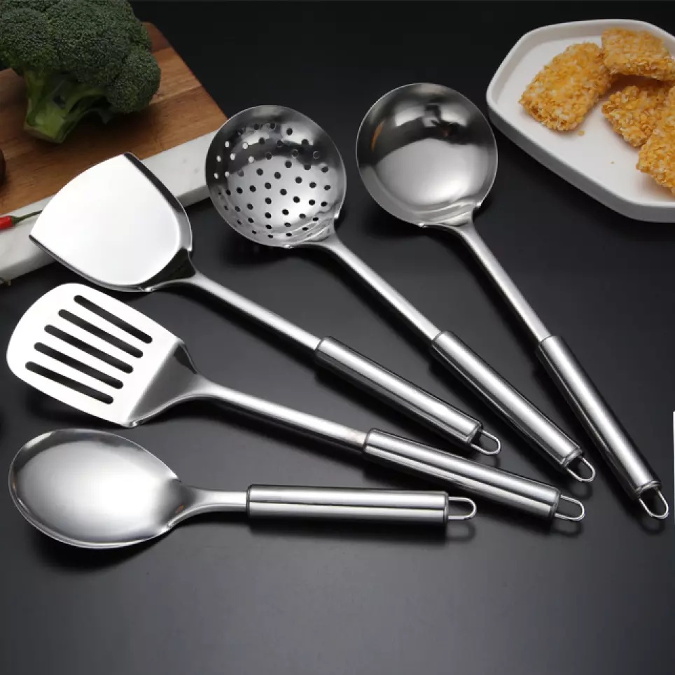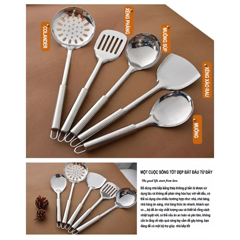 BỘ 5 Dụng cụ nhà bếp Muỗng cơm, Sạn, Vá Canh, Sạn lỗ, Vá lỗ - INOXBộ dụng cụ chế biến nấu ăn, phục vụ bàn ăn sang trọng phù hợp mọi gia đình, nhà hàng quán ăn