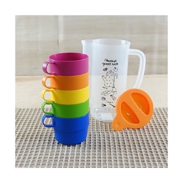 - Bộ sản phẩm có thiết kế 6 trong 1 rất tiện lợi với bình lớn vừa dùng để đựng nước vừa dùng để cất giữ ly khi không dùng đến. Bộ 5 cốc có thiết kế quai cầm chóng nóng cùng màu sắc đẹp mắt, tạo sự nổi bật cho không gian bếp gia đình bạn.