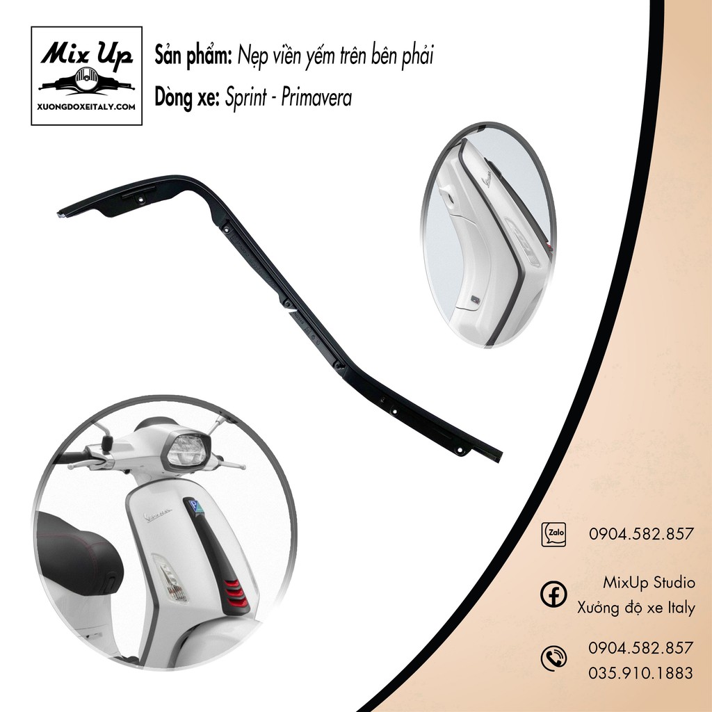 Nẹp viền yếm xe Vespa sử dụng để nạp trang trí phần viền yếm xe Vespa Sprint / Primavera. Nẹp được phủ một lớp sơn đen bóng, đem lại vẻ thu hút cho xe.Nẹp yếm xe Vespa có tác dụng như lá chắn bảo vệ xe không bị trầy xước khi va chạm.