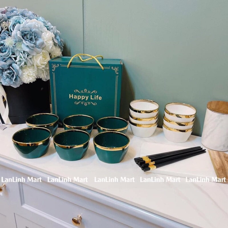 Giới thiệu BỘ 6 BÁT SỨ VIỀN VÀNG KÈM 6 ĐÔI ĐŨA ĐEN,CAO CẤP PHONG CÁCH,SANG TRỌNG