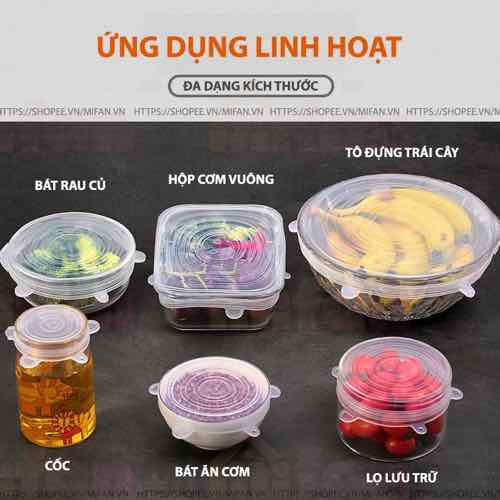 1 set gồm 6 nắp kích thước từ bé đến lớn, đảm đảo có thể đậy được từ bát nhỏ đến bát lớn, cực kín, cực khít.