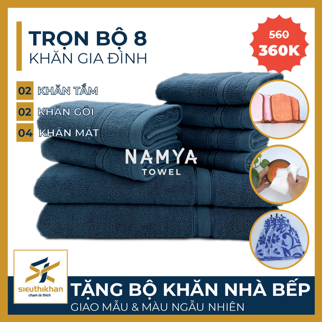 BỘ 8 KHĂN CHO GIA ĐÌNH: 2 KHĂN TẮM, 2 KHĂN GỘI, 4 KHĂN MẶT + BỘ KHĂN BẾP