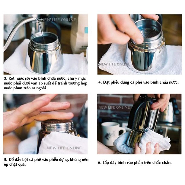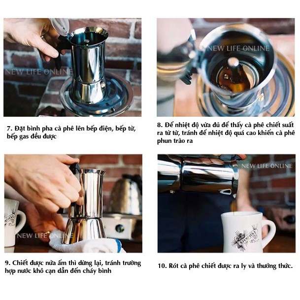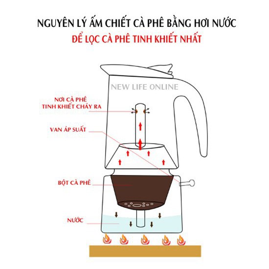 - Cà phê được hơn nửa ấm trên hoặc xì bọt thì nhắc ấm ra, vì nếu quá hết nước sẽ làm cháy ấm dưới