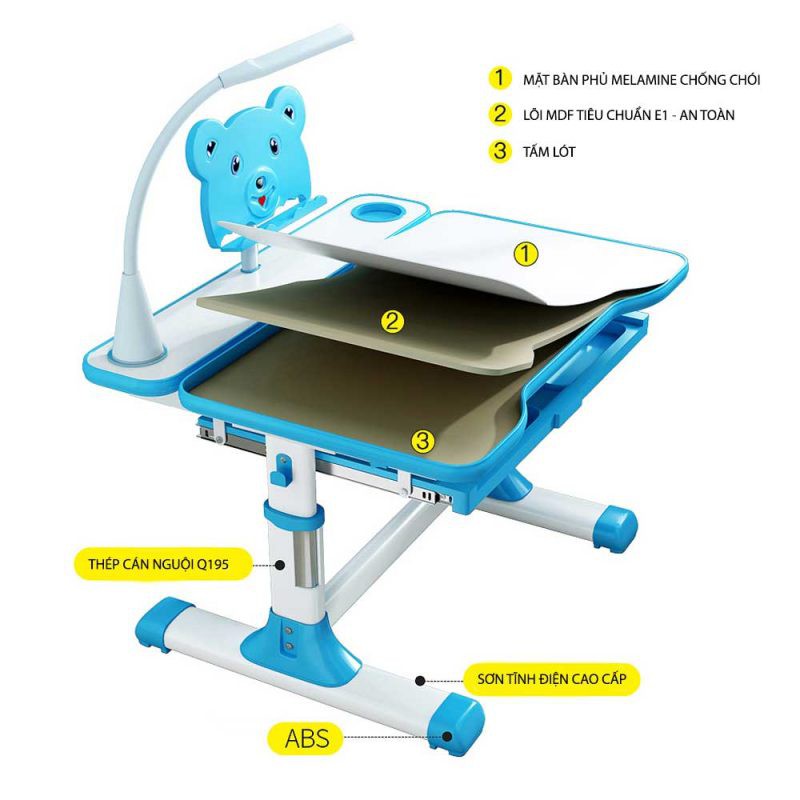 - Đi kèm bộ sản phẩm là đèn Led cao cấp có pin sạc với 3 chế độ ánh sáng phù hợp với mắt bé khi ngồi học.