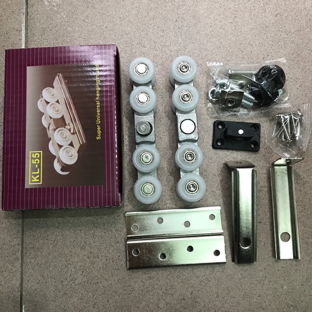 Bộ bánh xe cửa lùa treo 8 bánh hộp vải nhung sử dụng trong tủ nội thất cửa lùa.Bánh xe cửa lùa