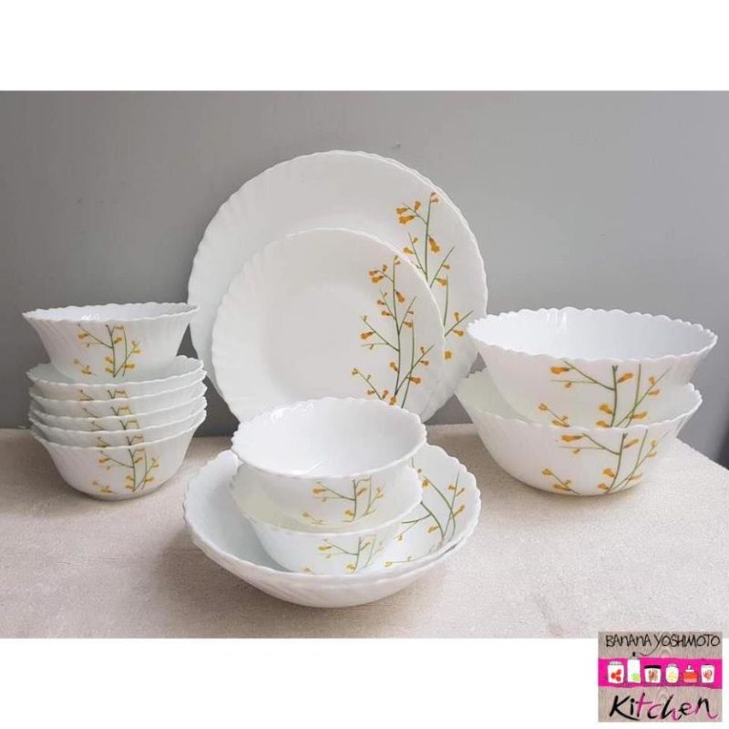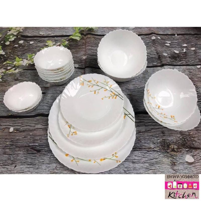 BỘ BÁT ĐĨA CAO CẤP GỒM 16 MÓN: - 6 chén cơm 12,5cm - 2 chén nhỏ 11cm - 2 tô 17,5cm - 2 đĩa sâu 17cm - 2 đĩa bằng 19cm - 2 đĩa cạn 25cm 💚 Bộ bát đĩa đẹp cực ,Dòng sứ thuỷ tinh cao cấp OPAL nên cầm nhẹ tênh, men sứ bóng trắng rất đẹp. Hình hoa lan rất nhẹ nhàng và tinh tế! 💚 Phần miệng bát, đĩa còn thiết kế hơi lượn sóng, chuẩn phong cách quý tộc của Hoàng gia, ngoài ra làm cho đũa không bị lăn. ‼️ Hàng nhập khẩu và sản xuất tại Ấn độ. 🌈🌈🌈 Bộ bát đĩa 16 chi tiết được sản xuất từ thủy tinh ngọc Opal là một loại thủy tinh đặc biệt, chế tạo từ vật liệu khi nung ở nhiệt độ cao thủy tinh chuyển từ trạng thái trong suốt sang màu trắng ngọc. Khác với những sản phẩm gốm sứ thông thường, thủy tinh ngọc sẽ rực sáng dưới ánh đèn tạo nên vẻ đẹp sang trọng. Đặc biệt, thủy tinh ngọc rất bền so với các chất liệu khác, có khả năng chống trầy xước cao, dễ làm sạch bởi bề mặt nhẵn bóng ít bám dính. 🌈🌈🌈 Thủy tinh ngọc Opal được sản xuất trên dây chuyền công nghệ hiện đại hàng đầu châu Âu đặc biệt, sản phẩm đã được kiểm chứng theo tiêu chuẩn FDA của Mỹ, không chứa chì và các hóa chất độc hại nên rất an toàn cho sức khỏe. 🌈🌈🌈 Sản phẩm được thiết kế tinh xảo, đường nét tinh tế, tỏa sáng lung linh dưới ánh đèn, không chỉ mang lại vẻ đẹp sang trọng và hiện đại cho bàn ăn, gian bếp nhà bạn mà còn góp phần trang trí, tô điểm cho không gian sống thêm ấn tượng. 🌈🌈🌈 Chất liệu đặc biệt với độ bền chắc cao, thích hợp để đựng các món ăn trong những bữa cơm gia đình, những buổi tiệc sang trọng...Giá SAVVA