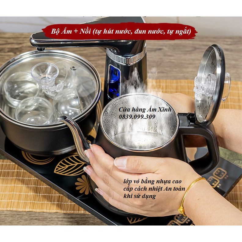 Nồi và ấm đều được làm bằng inox304 đẹp và rất an toàn vệ sinh. Phần nắp của nồi và ấm được thiết kế tự động mở ra khi có nước chảy vào, và đóng lại khi không có nước chảy vào.