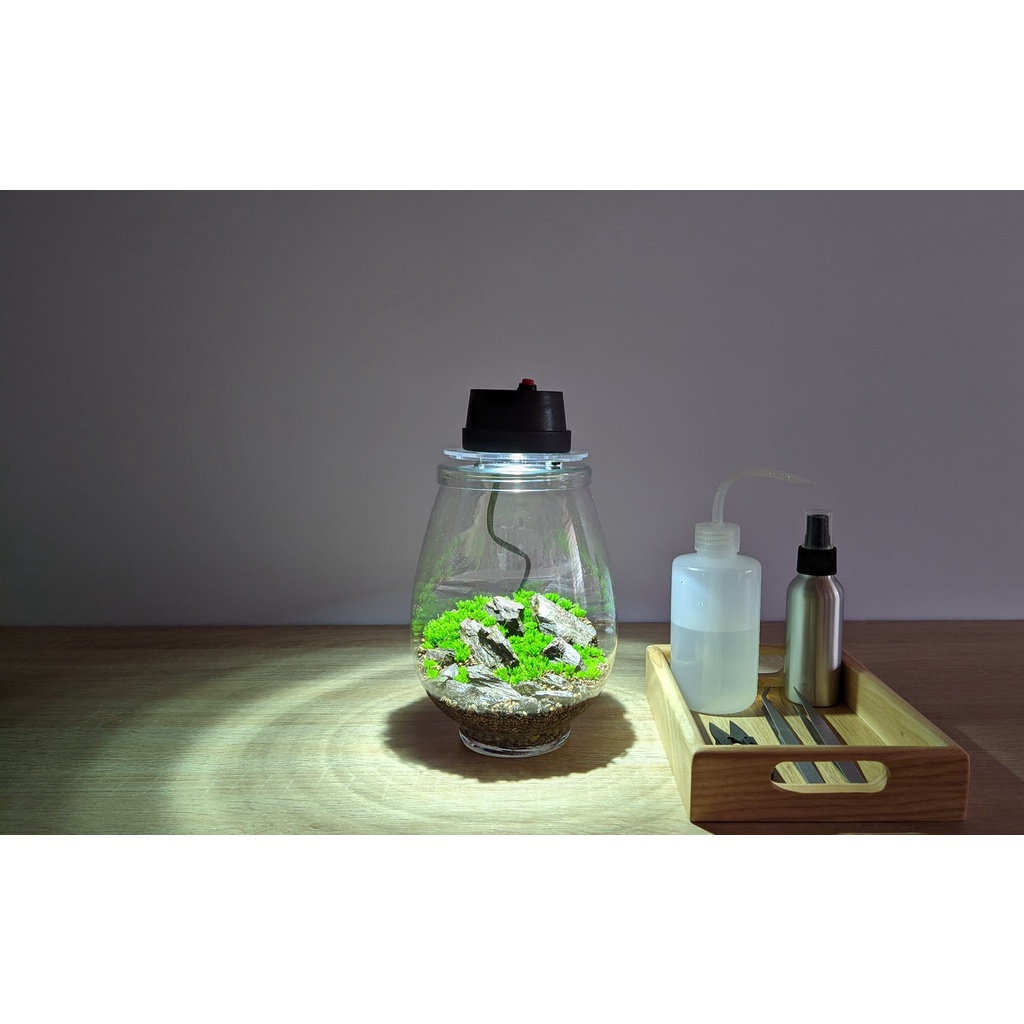 Nắp đèn thiết kế với ánh sáng trắng nhiệt độ màu 6000k, cường độ nhẹ phù hợp với kích thước bình. Ánh sáng và cường độ thích hợp sử dụng cho rêu và một số loại cây như sam hương, hồng ngọc mai, dương xỉ.