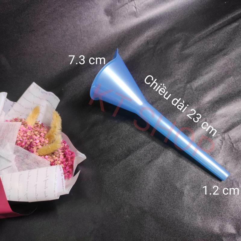 1 phiễu nhựa dài 23 cm, miệng phiễu 7.3 cm, đường kính đầu ra 1.2 cm.