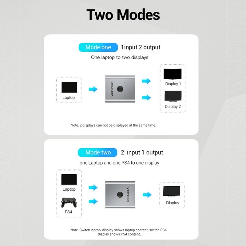 1). Hoạt động như một công tắc HDMI, kết nối máy tính xách tay và PS4 đến màn hình hiển thị, nhấn nút để chuyển đổi nguồn bạn muốn xem.