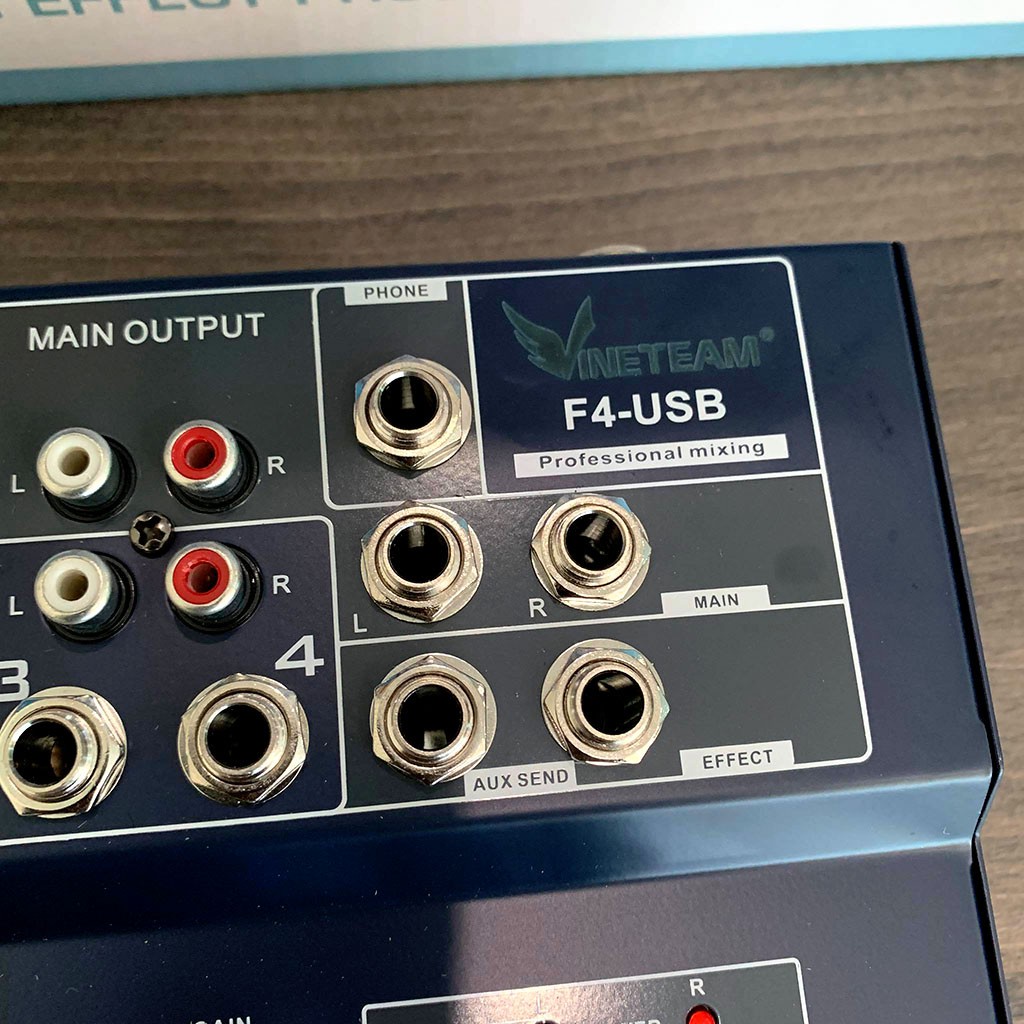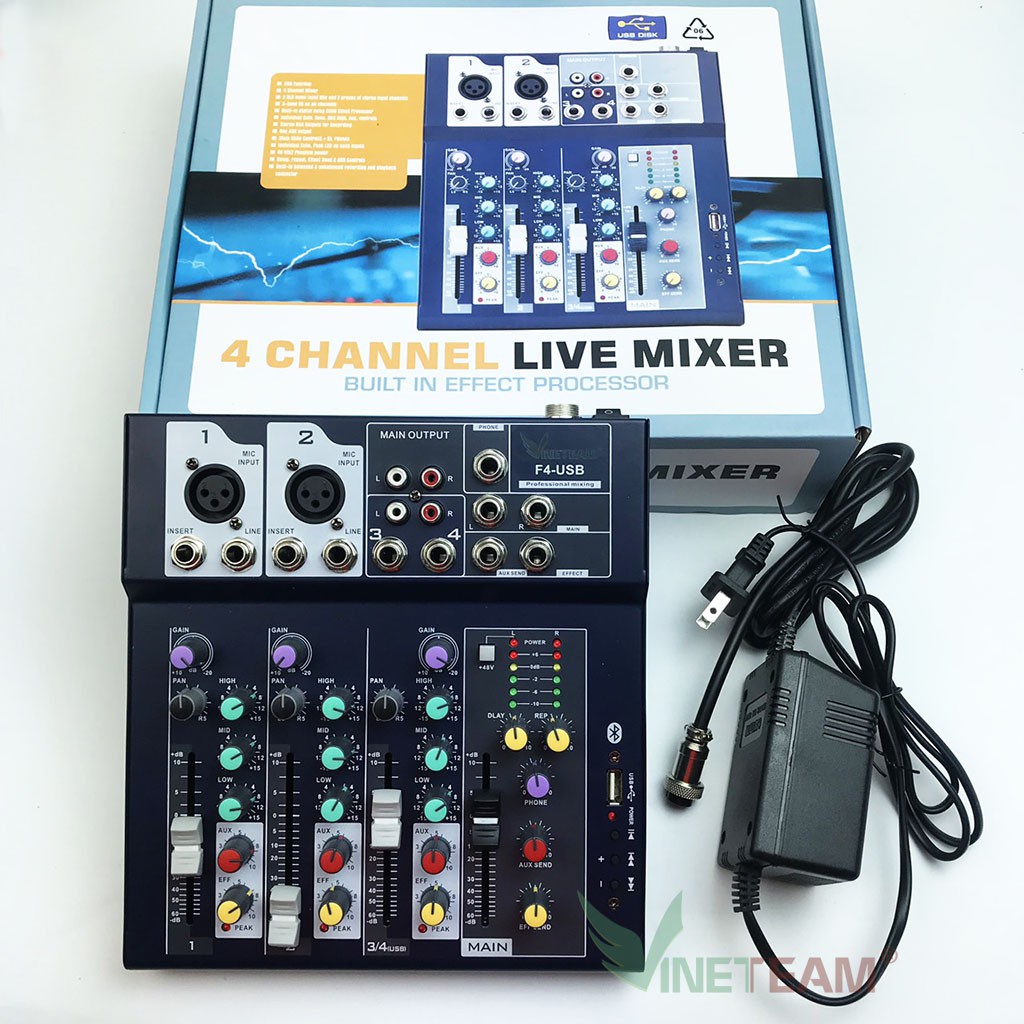 BỘ CHỘN ÂM THANH KARAOKE MIXER VINETTEAM F4 USB CÓ BLUETOOTHBộ trộn âm thanh Mixer F4-USB là dòng mixer mini xử lý hiệu ứng âm thanh chất lượng cao với 4 kênh đầu vào, cung cấp nguồn phantom 48V cho mic condenser, hỗ trợ nghe nhạc, thu âm và hát karaoke.