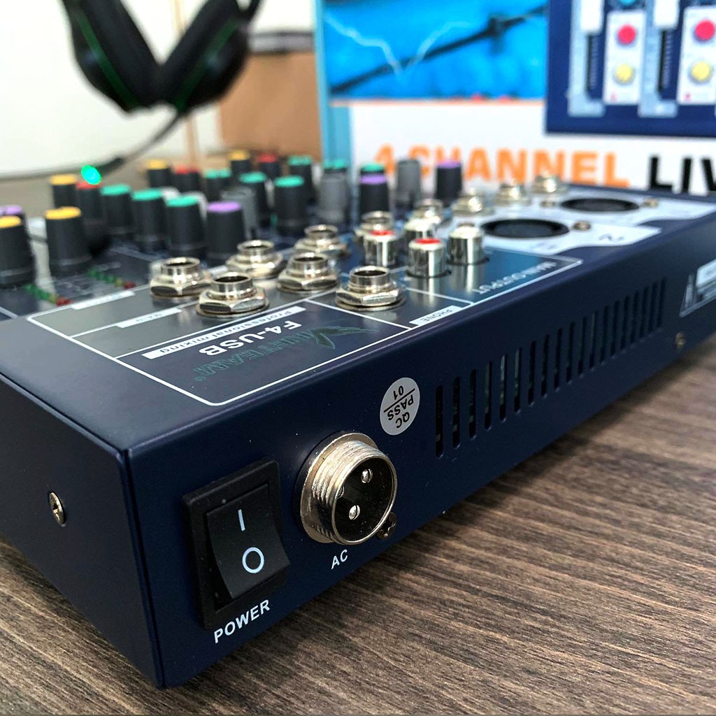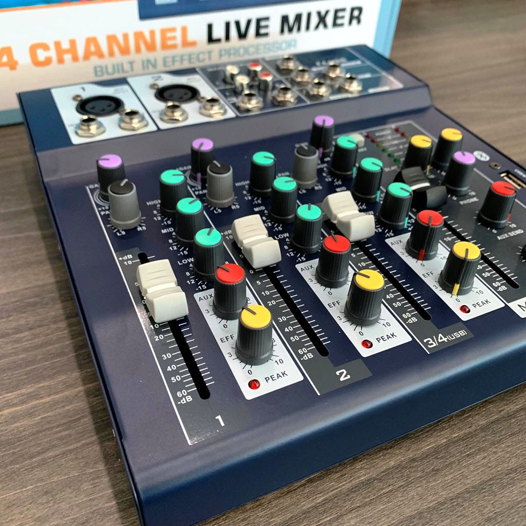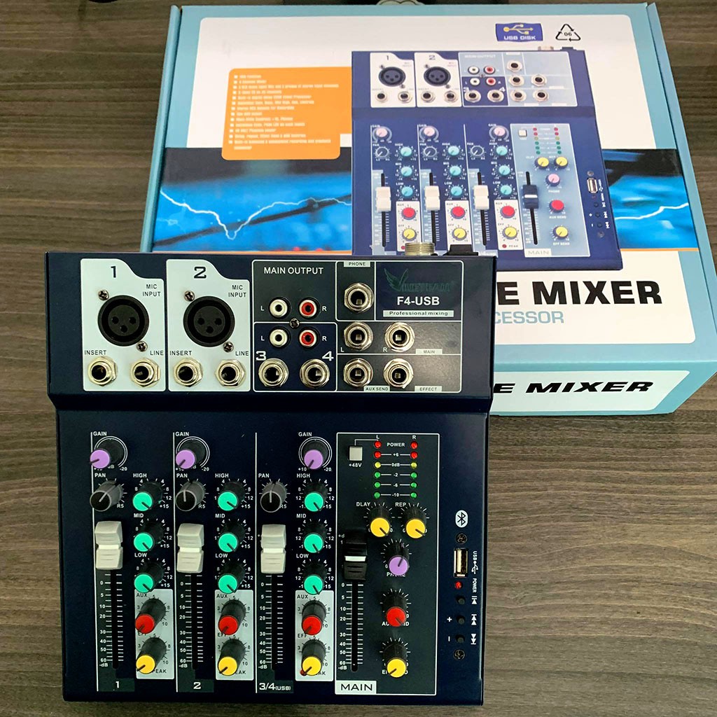 - Bộ trộn âm thanh Mixer F4-USB là dòng mixer mini xử lý hiệu ứng âm thanh chất lượng cao với 4 kênh đầu vào, cung cấp nguồn phantom 48V cho mic condenser, hỗ trợ nghe nhạc, thu âm và hát karaoke.