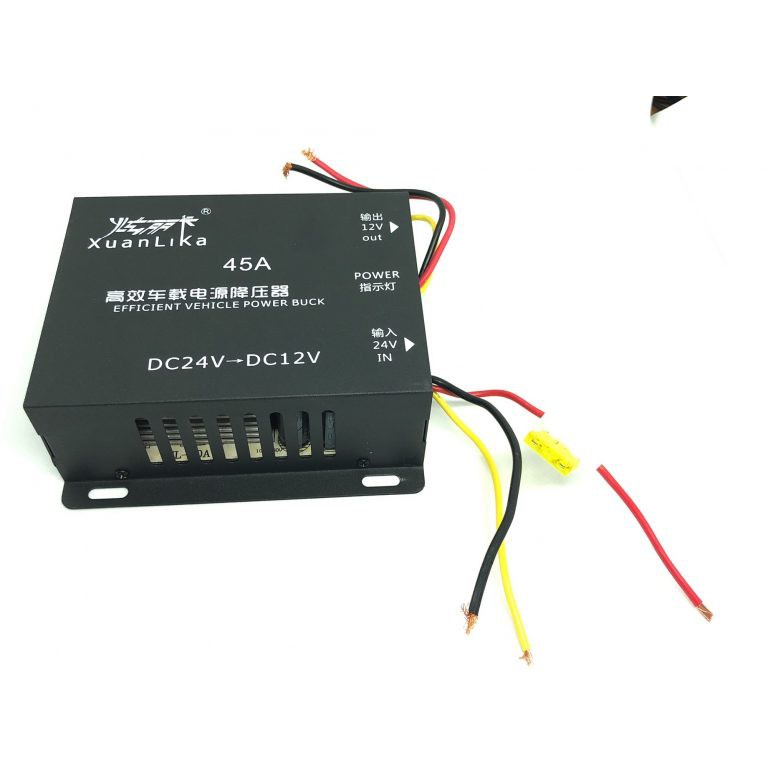Bộ chuyển đổi Kích thước Cắm: Có 2 đầu dây vào điện 24v và 2 đầu dây ra 12v ( phân biệt âm dương màu )