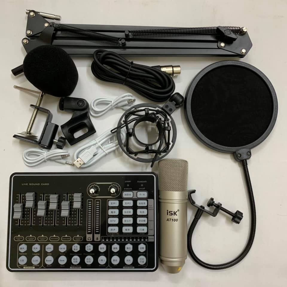 BỘ COMBO míc hát karaoke livestream online micro ISK AT100 CARD H9 BLUETOOTH THẾ HỆ MỚI 21 HIỆU ỨNG chân kẹp màng lọc